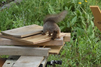 エゾリスは鳥類ほど頻繁ではありませんが、初夏には子どものエゾリスが裏庭のマツから餌台に降りてくることがあります。