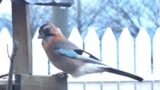 ミヤマカケスは、秋から冬にかけてやってくることが多く、地面をつついたり、表・裏どちらの餌台も利用しますが、その姿があるときは、スズメやシジュウカラ、ゴジュウカラは近寄らないようです。