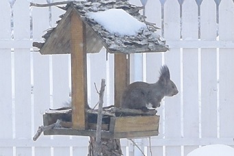 秋から冬にかけては、裏庭のマツを訪れる回数が多くなり、大人のエゾリスは雪の積もっている時期に、表の餌台に現れることもあります。