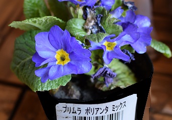 「プリムラ ポリアンタ ミックス」のラベルが貼られているポット苗。
